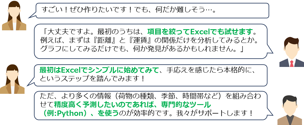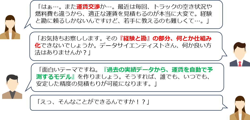今回より、より分かりやすくお伝えするため、現場の担当者とコンサルタント、データサイエンティストの3者の対話形式で内容を説明するようにしています。